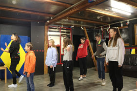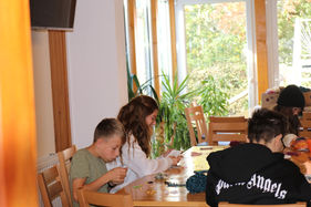 Heute sind wir wieder in die Vergangenheit gereist und gelandet sind wir in den 80/90ern Jahren. Wie immer startete unser Tag mit einer Morgenrunde und dann einem leckeren Frühstück. Beim Frühstück kündigten wir das Morgenprogramm an, dies waren drei Workshops, die in den Rudeln bearbeitet wurden. Einmal haben wir aus Wolle und Loom Bands Armbänder geknüpft, der zweite Workshop war basteln. In diesem Workshop haben wir aus Pappe Masken und Dekoration für die Disko am Abend vorbereitet. Der letzte Workshop war eine Choreografie vorzubereiten, die dann Abends bei der Disko vorgeführt wurden. Am Nachmittag sind wir zum Sportplatz gelaufen und haben ein paar Runden Brennball gespielt.