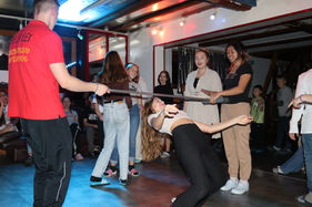 Begonnen hat der Tag mit einer Reise ins Mittelalter. Es ertönten Trompeten und Fanfaren und der Hofnarr Simon und König Devorius der Erste erschienen. Sobald die Trompeten endeten, wurde verkündet, dass König Devorius der Erste alle zu einer riesigen Feier am Abend einlud, unter der Voraussetzung passende festliche Kleidung zu tragen. Am Vormittag haben wir uns auf den Abend vorbereitet. Es wurden kleine Lederbeutel als Accessoire gemacht, Wappen gemalt, die bei der Modenshow am Abend als Deko dienten und die verschiedenen Forscherteams repräsentierten. Außerdem gab es noch die wichtigste Station, bei der alle Kleidung für unsere Modenshow anfertigten. Am Nachmittag wurde das Spiel Siedler gespielt, bei dem sie sich ihre eigene Stadt erbaut haben, indem sie mit Ressourcen gehandelt haben. Bei der Modenshow am Abend stellte jedes Team ihre Kleidung vor. Im Anschluss darauf gab es eine Disco, um den gelungenen Tag zu feiern.
